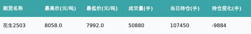南方财经1月20日电,南财金融终端盘后期货数据显示,郑州商品交易所的花生主力合约收跌0.45%,收盘报8038.0元/吨,日内资金流出6768.82万元。其他相关指标见下表: