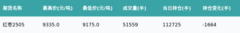 南方财经1月20日电,南财金融终端盘后期货数据显示,郑州商品交易所的红枣主力合约收跌0.54%,收盘报9285.0元/吨,日内资金流出2197.2万元。其他相关指标见下表: